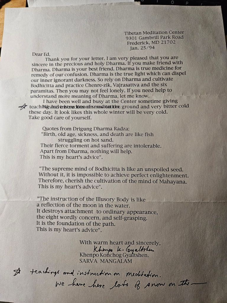 That year, as I had for many years, I struggled with feelings of lonelinss. I wrote to Khenpo, telling him that I felt lonely. I felt so alone and isolated. He wrote back to me. It was the first letter he wrote to me. The first of many in our long correspondence.